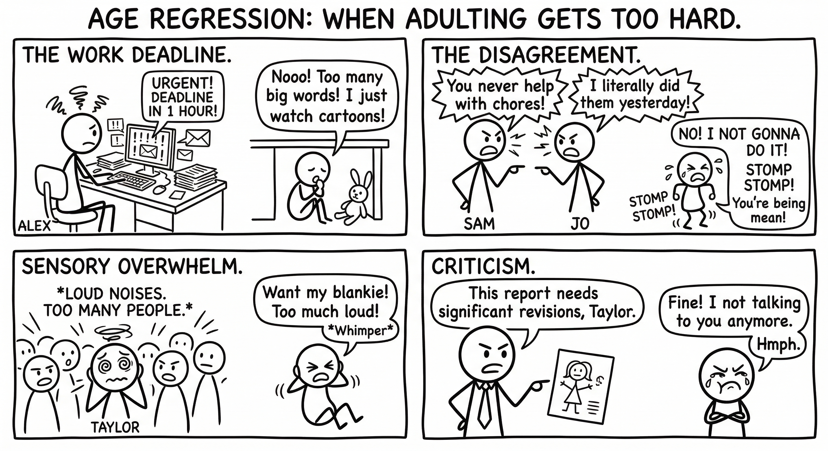 A competent adult is handling a stressful situation until a trigger hits and they visibly shrink -- their suit gets bigger, their voice gets smaller, and suddenly they are responding to the world as a much younger version of themselves.