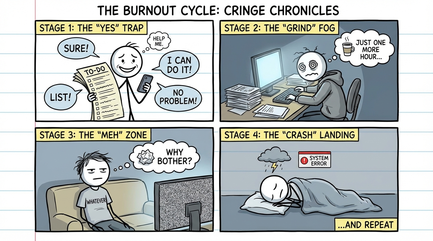 Burnout does not arrive overnight. It follows a remarkably predictable cycle -- one that researcher Herbert Freudenberger first identified in the 1970s and Christina Maslach later expanded into the Maslach Burnout Inventory, the most widely used framework for understanding burnout today. The cycle typically begins with an enthusiastic commitment phase -- you are motivated, energized, and willing to go the extra mile. Then comes the onset of stress: sleep gets shorter, boundaries get thinner, and the to-do list starts feeling like a treadmill. Next is chronic stress, where the symptoms become your baseline -- irritability, fatigue, cynicism, and a creeping sense that nothing you do is enough. Finally, there is the burnout stage itself: emotional exhaustion, depersonalization, and a collapse of the sense of personal accomplishment. The cruelest part of the burnout cycle is that the very qualities that make you vulnerable to it -- conscientiousness, empathy, high standards, a deep sense of responsibility -- are the same ones that make it nearly impossible to recognize it is happening until you are already deep inside it. Your nervous system adapts to the overload, normalizing what should be an alarm signal. Understanding the stages is the first step toward interrupting the pattern before it reaches the point of collapse -- and learning that sustainable effort, not relentless effort, is what actually gets you where you want to go.
