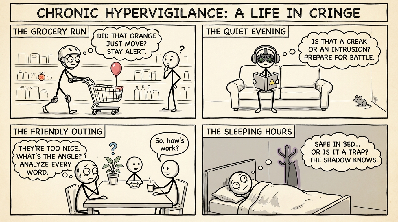 Chronic hypervigilance is a state of heightened sensory sensitivity and constant scanning for threats -- even when you are objectively safe. It is your nervous system stuck in 'on' mode, treating every unexpected sound, ambiguous facial expression, or minor change in someone's tone as a potential danger. This response made sense once. At some point in your life -- whether through trauma, an unpredictable home environment, bullying, or chronic stress -- your brain learned that letting your guard down was dangerous. So it stopped letting your guard down, ever. The amygdala, your brain's threat detection center, became overactive, while the prefrontal cortex -- responsible for rational assessment -- lost some of its ability to override the alarm. Bessel van der Kolk, in 'The Body Keeps the Score,' describes how trauma literally rewires the brain's alarm system, leaving it calibrated for a world that may no longer exist. Stephen Porges' Polyvagal Theory explains this as a nervous system stuck in sympathetic activation -- the fight-or-flight branch running the show long after the original threat has ended. The result is exhausting: you cannot relax in social situations, you read danger into neutral events, you sleep lightly if at all, and your body carries tension like a permanent second skin. Healing hypervigilance is not about ignoring danger -- it is about teaching your nervous system to distinguish between then and now, so it can finally stand down when standing down is safe.
