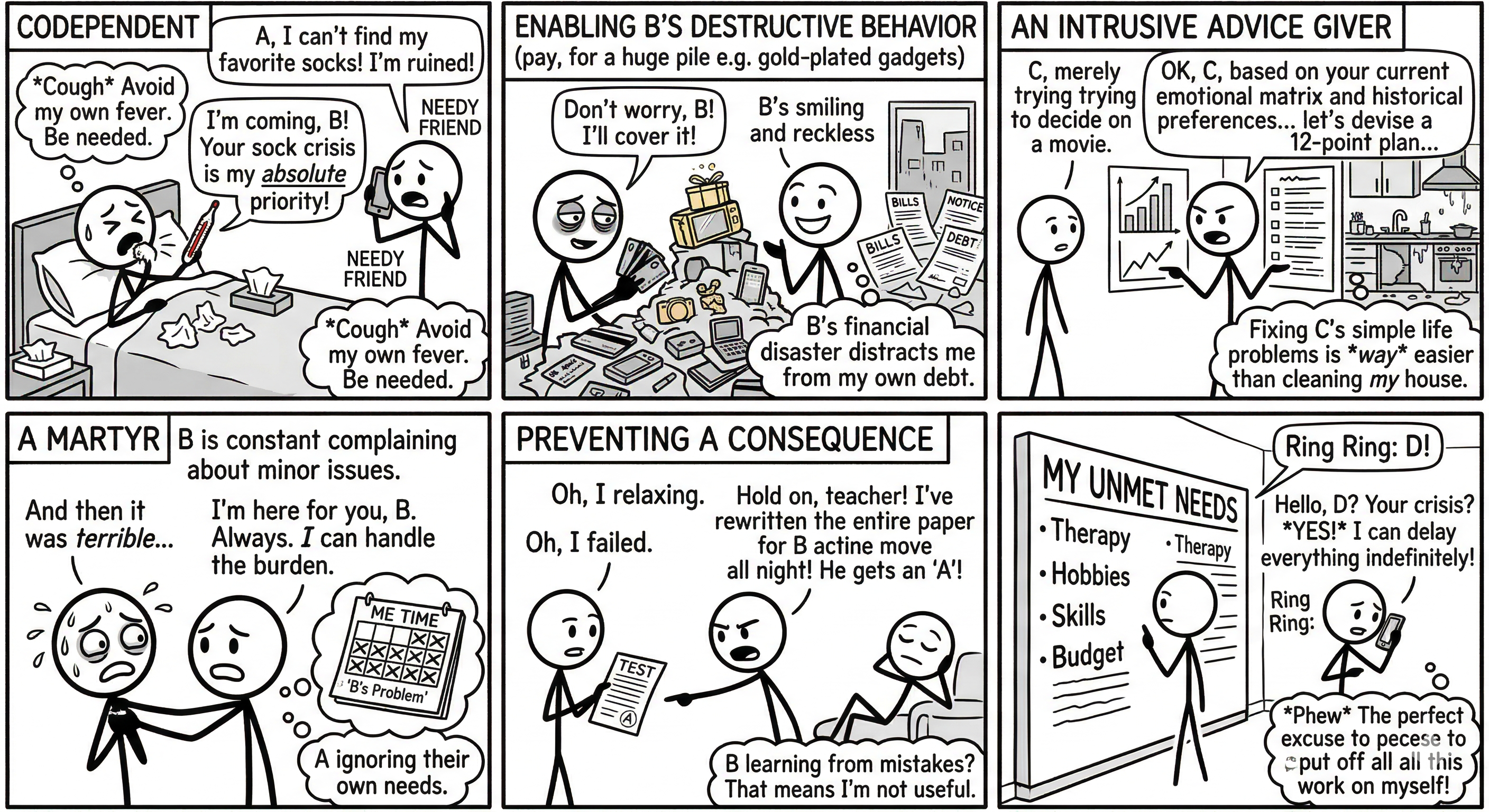 A codependent person rushes to fix someone else's problems, neglecting their own life in the process, because being needed feels safer than addressing their own issues.