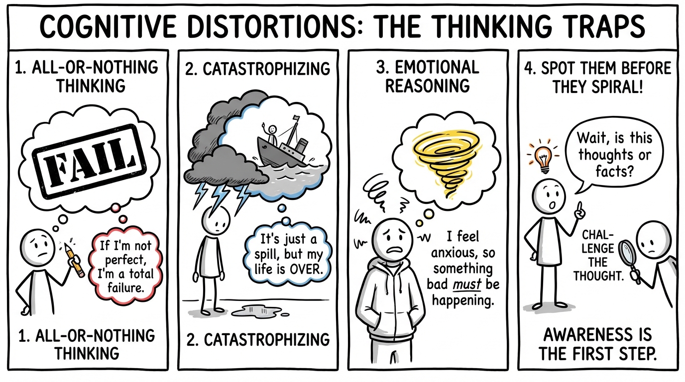 Cognitive distortions are systematic errors in thinking that distort your perception of reality. First identified by psychiatrist Aaron Beck and later expanded by David Burns in 'Feeling Good,' these mental shortcuts feel completely logical in the moment but lead you to conclusions that are exaggerated, irrational, or simply untrue. Common distortions include catastrophizing (assuming the worst will happen), mind reading (believing you know what others think), all-or-nothing thinking (seeing things in black and white), and personalization (assuming everything is about you). Everyone experiences cognitive distortions -- they are a normal part of being human. The goal is not to eliminate them entirely but to develop the awareness to catch them in action. When you can name the distortion, you weaken its grip on your emotions and decisions.