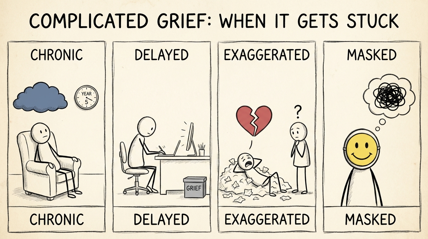 Most grief, as devastating as it is, gradually shifts. The acute pain softens -- not because you forget or stop caring, but because the psyche slowly integrates the loss into a new reality. Complicated grief is what happens when that process stalls. Also called prolonged grief disorder, it was formally recognized as a diagnosis in the DSM-5-TR and is characterized by intense, persistent longing, difficulty accepting the loss, emotional numbness, and a sense that life has lost its meaning -- lasting well beyond the expected adjustment period. Researcher M. Katherine Shear, who developed Complicated Grief Treatment, describes it as a derailment of the natural adaptation process. The grieving person becomes stuck in a loop: unable to move forward, unable to return to who they were before, and often unable to even articulate why they cannot seem to get better. Complicated grief is not a sign of weakness or excessive attachment. It often emerges when the loss was sudden, traumatic, or deeply tied to the person's identity. It can also be fueled by unresolved guilt, ambivalent relationships, or a lack of social support. The critical thing to understand is that being stuck is not a character flaw -- it is a signal that the grief needs a different kind of support. With the right help, including specialized therapeutic approaches, the adaptation process can restart and meaning can slowly re-enter a life that felt permanently hollowed out.