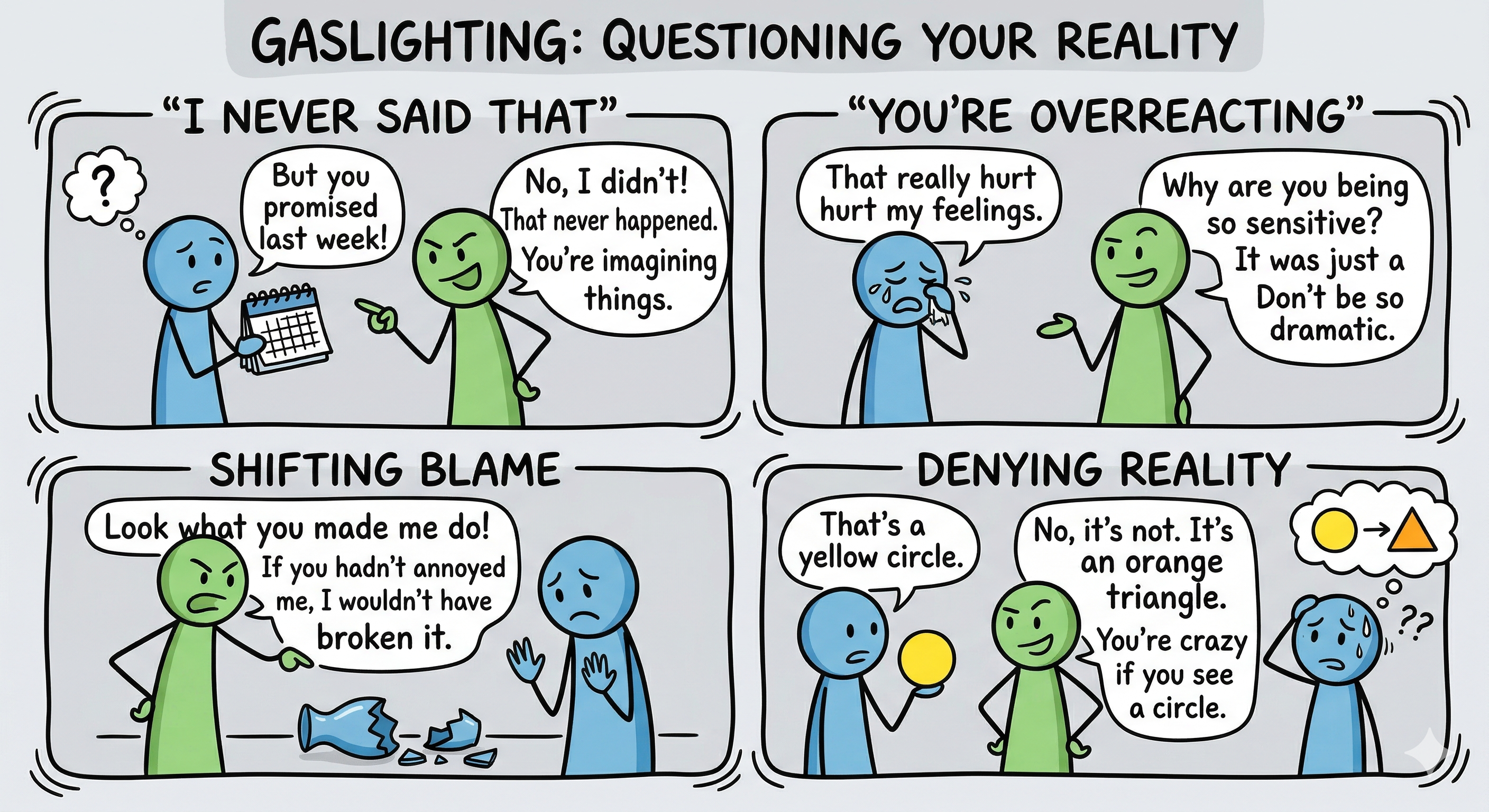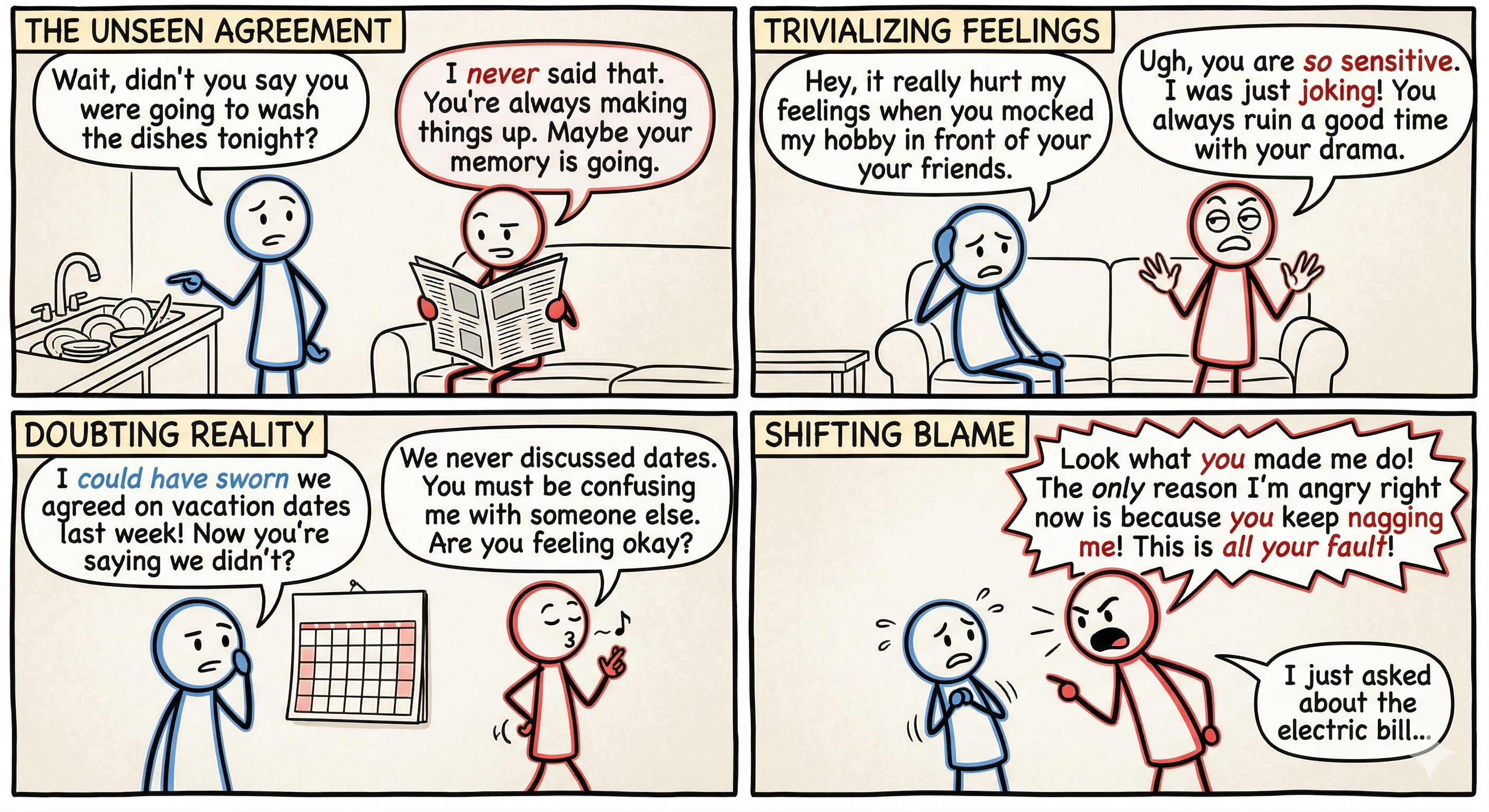 Trust your own memory and instincts -- if someone consistently makes you question reality, the distortion is theirs, not yours.
