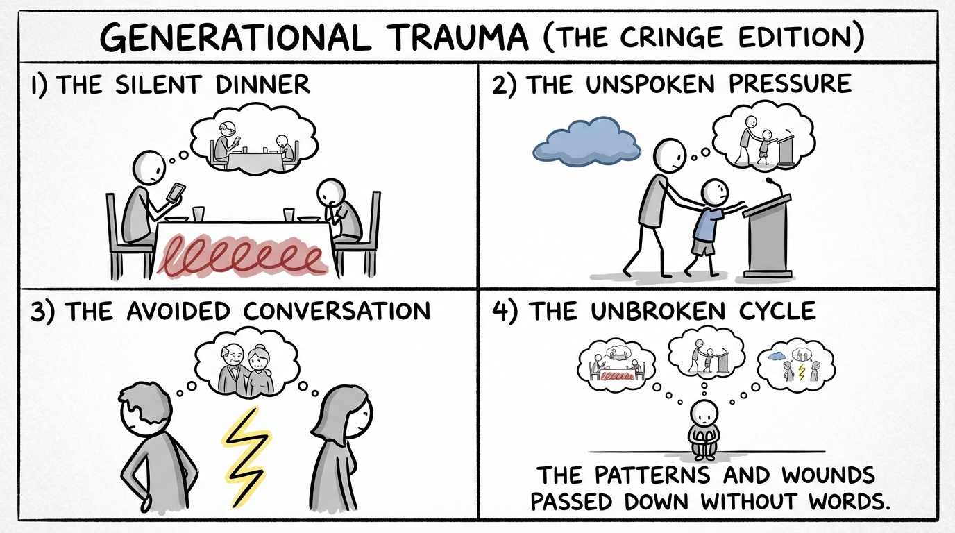 Generational trauma -- sometimes called intergenerational or transgenerational trauma -- refers to the emotional wounds, coping patterns, and unresolved pain that get passed down from one generation to the next, often without anyone naming what's happening. Your grandmother's unprocessed grief becomes your mother's anxiety, which becomes your chronic people-pleasing. It moves through families not in dramatic revelations but in the small, quiet ways: the things that are never talked about, the emotions that aren't allowed, the survival strategies that made sense in one generation but become cages in the next. Researchers like Rachel Yehuda have studied how trauma can even alter gene expression through epigenetic changes, showing that the effects of overwhelming stress can literally be passed down biologically. But most generational trauma travels through behavior -- through parenting styles shaped by pain, through emotional unavailability rooted in survival, through rigid family rules that once protected someone but now just restrict. You might carry grief you can't explain, fears that don't match your own experiences, or patterns you keep repeating despite knowing better. Understanding generational trauma isn't about blaming your parents or their parents -- it's about recognizing that you can be the generation that finally looks inside the box, names what's there, and chooses something different.