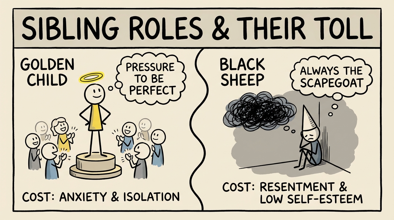 In many families, children get sorted into roles that serve the family system more than they serve the children themselves. The golden child is idealized -- held up as the family's proof that everything is fine. The black sheep is marginalized -- cast as the reason things go wrong. Neither role is chosen, and neither role is free. The golden child pays with the pressure of perfection, the terror of falling from grace, and an identity built on performance rather than authenticity. The black sheep pays with rejection, shame, and the constant message that who they are is not enough. Family therapists working in the tradition of Virginia Satir recognized these rigid role assignments as survival strategies for the family system -- ways of organizing anxiety and maintaining a fragile equilibrium. The tragedy is that both siblings are trapped in a dynamic that pits them against each other while the real issues go unaddressed. If you were the golden child, you might struggle to know who you are without achievement. If you were the black sheep, you might struggle to believe you deserve good things. Healing begins when you realize that the role you were given was never a reflection of your worth -- it was a reflection of what your family needed you to carry.