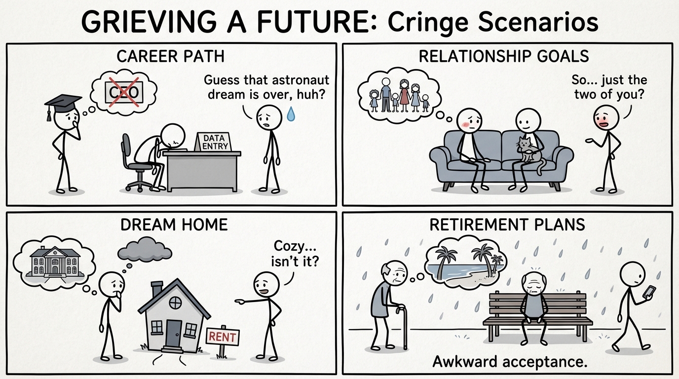 Sometimes the most painful thing you lose is something you never actually had -- a future you imagined, planned for, and emotionally invested in. Grieving a future is the process of mourning a life trajectory that is no longer possible. Maybe a diagnosis changed everything. Maybe a relationship ended and took with it the shared vision of a house, a family, a growing-old-together story. Maybe career plans collapsed, fertility did not cooperate, or the world itself shifted in ways that made your original blueprint obsolete. This type of grief is disorienting because there is no tangible thing to point to and say, 'This is what I lost.' You are mourning a possibility -- a version of yourself who got to live a different story. Psychologists sometimes frame this through the lens of shattered assumptions, a concept explored by Ronnie Janoff-Bulman, which describes how traumatic or disruptive events break our core beliefs about how the world is supposed to work. When your assumed future shatters, it does not just hurt -- it destabilizes your identity. You have to rebuild not just your plans but your sense of who you are without that story. The work of grieving a future is not about replacing the old vision with a new one right away. It is about sitting with the gap, acknowledging what the lost future meant to you, and slowly -- painfully, honestly -- learning that you can author a meaningful life even when the first draft was torn up.