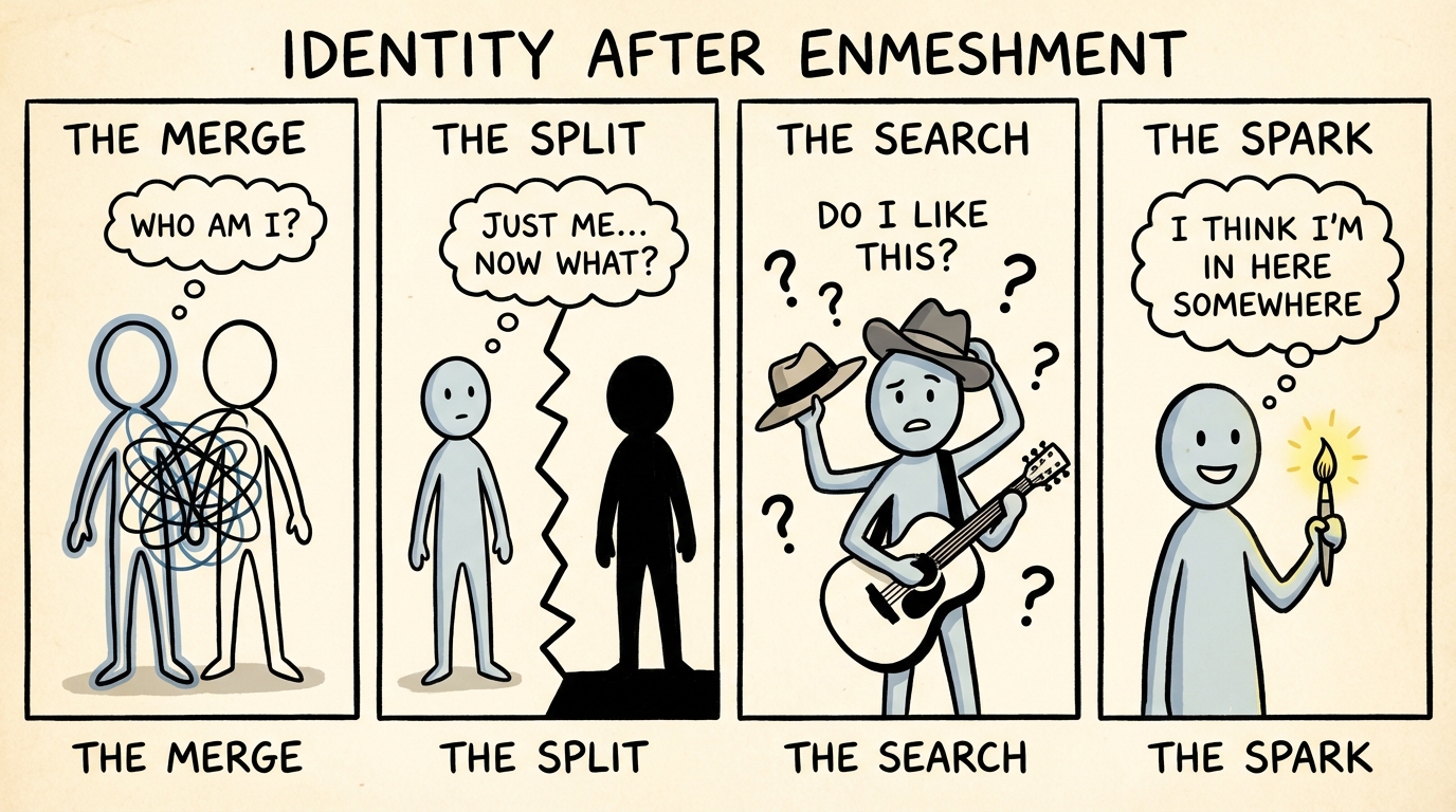 Identity after enmeshment is the disorienting process of trying to figure out who you are once you step out of a relationship or family system where your identity was fused with someone else's. Enmeshment -- a concept from Salvador Minuchin's structural family therapy -- describes relationships where boundaries are so blurred that individual identities become indistinguishable. When you have been enmeshed, your preferences, opinions, goals, and even your emotions may have been shaped entirely by the other person or the system you were part of. Leaving an enmeshed dynamic -- whether it is a romantic relationship, a friendship, or a family role -- often triggers a profound identity crisis. You might suddenly realize you do not know what music you actually like, what you believe about politics, or what you want from your own life. The questions that seem simple to other people -- 'What are your hobbies?' or 'What do you want to do this weekend?' -- can feel impossible to answer. This is not because something is wrong with you. It is because the parts of you that would normally develop those answers were outsourced to someone else for a long time. Rebuilding identity after enmeshment is not a single breakthrough moment -- it is a slow, sometimes uncomfortable process of experimentation. It means trying things, tolerating the anxiety of not knowing who you are yet, and giving yourself permission to change your mind as many times as you need to. You are not starting from nothing -- you are uncovering what was always there.