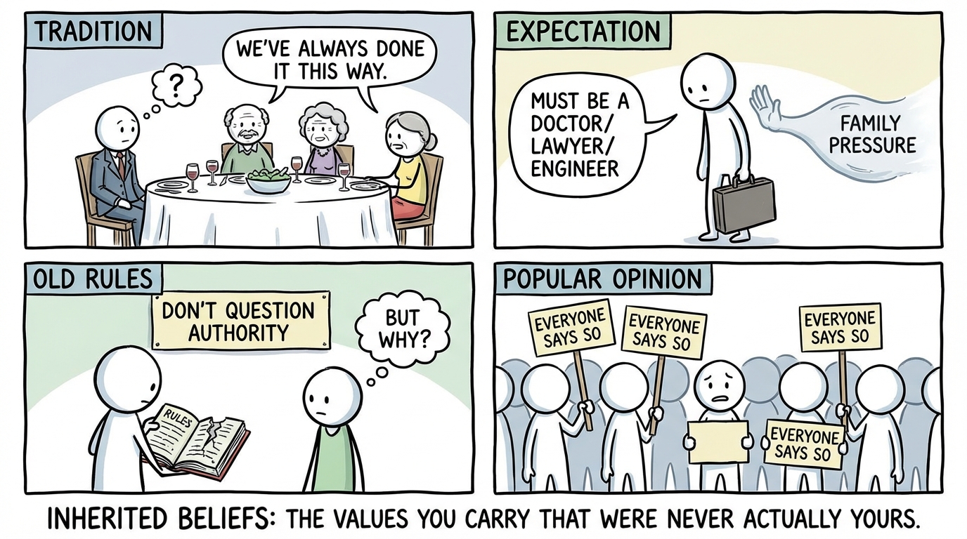 Inherited beliefs are the assumptions, fears, values, and worldviews that were passed down to you by your family and culture -- beliefs you absorbed before you were old enough to question them. They live in the background of your mind, shaping your decisions, your relationships, and your sense of what is possible, often without you realizing they are even there. Some of these beliefs are explicit -- things your parents said directly, like 'money is the root of all evil' or 'you can not trust anyone outside the family.' Others are implicit -- absorbed through observation, like watching your mother swallow her anger or your father treat vulnerability as weakness. Family systems theory and the work of Murray Bowen describe how emotional patterns and belief systems travel through generations in a process called multigenerational transmission. You did not just inherit your grandmother's eyes -- you may have also inherited her anxiety, her distrust of outsiders, or her belief that love must be earned through sacrifice. The tricky part is that inherited beliefs feel like facts. They do not feel borrowed -- they feel like 'just the way things are.' The work of examining inherited beliefs is not about blaming your family. It is about developing the awareness to sort through what you were given and consciously decide what you want to keep, what you want to modify, and what you want to set down. You get to choose your own beliefs now -- and that choice is one of the most powerful forms of freedom available to you.
