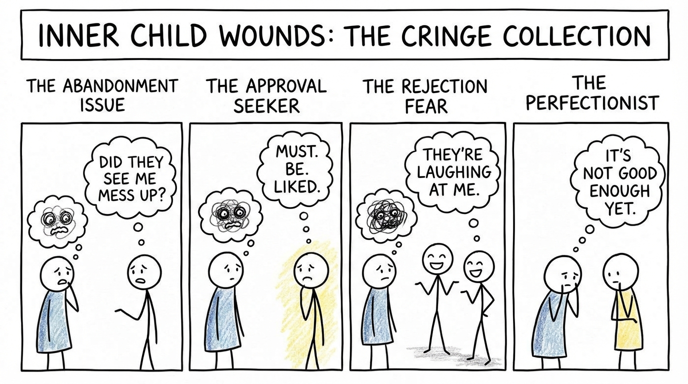 Inner child wounds are the unresolved emotional injuries from childhood that continue to influence your thoughts, feelings, and behaviors as an adult. They are not just memories -- they are active, living parts of your psyche that get triggered whenever a present situation resembles the original painful experience. Common inner child wounds include abandonment (learning that people leave), rejection (learning that who you are is not acceptable), humiliation (learning that your feelings and needs are ridiculous), betrayal (learning that trust is dangerous), and injustice (learning that the world is unfair and you are powerless). These wounds form the emotional blueprint that shapes your adult patterns: who you are attracted to, what you tolerate in relationships, how you respond to conflict, what you avoid, and what you overcompensate for. The inner child does not understand that decades have passed. When a wound is activated, it responds with the same intensity and the same limited coping strategies it had at the age the wound was created. Healing inner child wounds is not about going back and changing what happened. It is about developing a relationship with the wounded parts of yourself so they no longer have to run the show from behind the scenes.