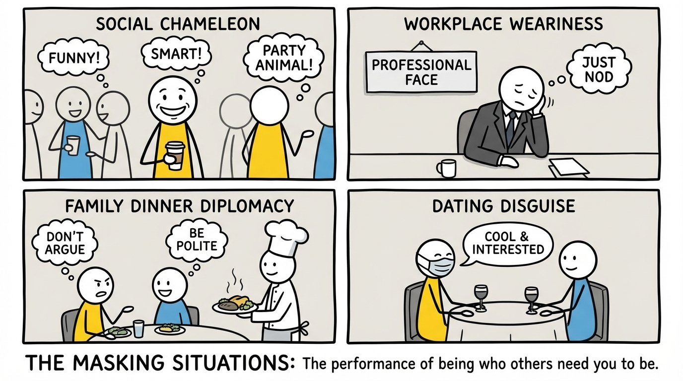 Masking is the act of suppressing your authentic thoughts, feelings, and behaviors in order to present a version of yourself that feels safer or more acceptable to the people around you. Everyone masks to some degree -- we all adjust our tone in a job interview or filter what we share on a first date. But for some people, masking is not situational -- it is constant. It becomes so automatic that you stop noticing you are doing it. The concept has roots in Erving Goffman's dramaturgical theory, which describes social life as a series of performances where people manage the impressions they give to others. More recently, masking has been explored extensively in neurodivergent communities, where individuals often learn to camouflage their natural ways of thinking and communicating to fit neurotypical expectations. But masking extends far beyond neurodivergence -- anyone who grew up in an environment where certain emotions, needs, or parts of their personality were unwelcome may have learned to hide those parts so thoroughly that they forgot they existed. The exhaustion of masking is not just social fatigue -- it is the grief of living at a distance from yourself. The good news is that recognizing the mask is the first step toward putting it down. You do not have to perform your way through life, and the people who are worth keeping around are the ones who want the real version of you.