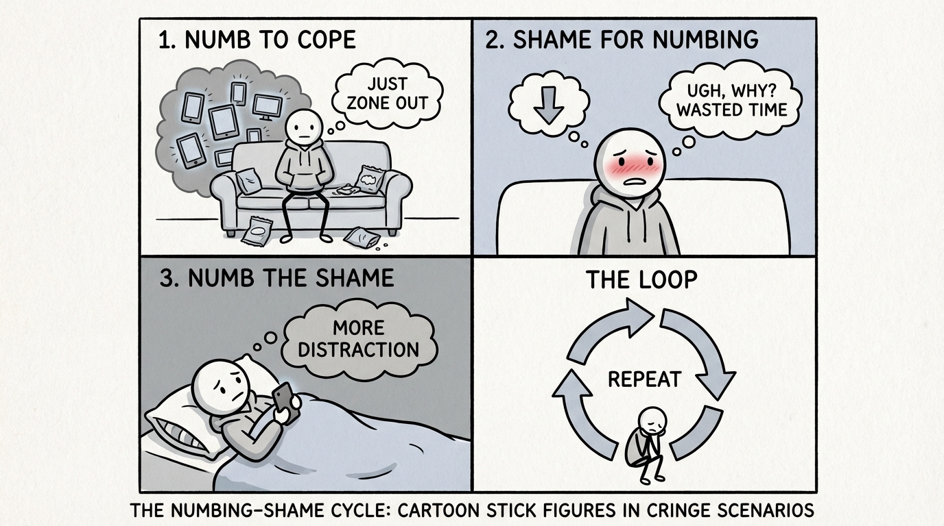 The loop of numb to cope, then shame for numbing, then numb the shame.
