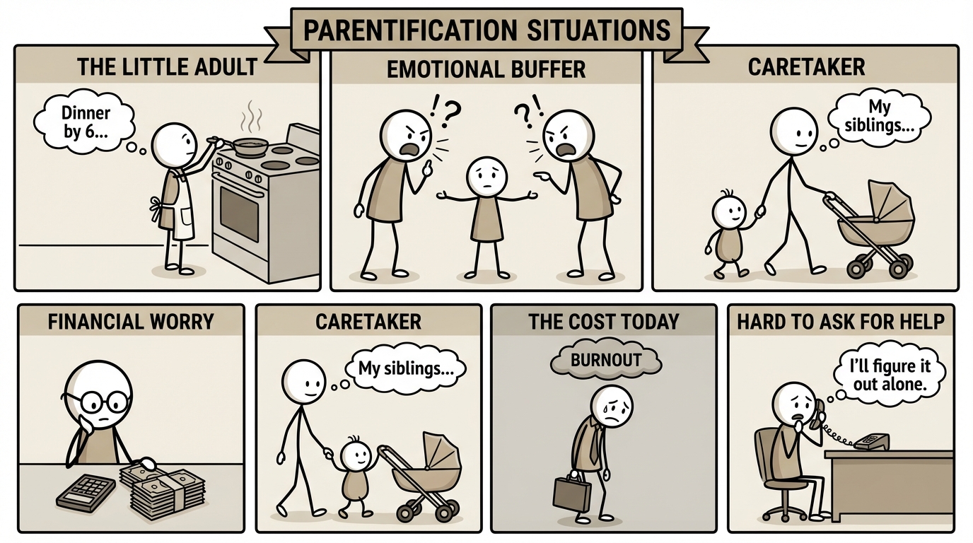 Parentification is a role reversal in which a child is put in the position of meeting the emotional or practical needs of a parent or the family system. Instead of being cared for, the child becomes the caretaker. There are two forms. Instrumental parentification involves taking on adult responsibilities like cooking, cleaning, managing finances, or caring for younger siblings -- essentially running the household. Emotional parentification is subtler and often more damaging: the child becomes the parent's confidant, therapist, mediator, or emotional regulator. They listen to adult problems, manage a parent's moods, keep secrets, or take on the burden of holding the family together emotionally. Parentified children are often described as mature, responsible, and wise beyond their years. These are compliments that mask a deeper truth: the child was forced to skip their own developmental needs to serve someone else's. The long-term effects include chronic caretaking in adult relationships, difficulty identifying your own needs, guilt when prioritizing yourself, burnout, resentment, and a deep sense that your worth is tied to what you do for others. Healing from parentification means learning that you are allowed to have needs, that rest is not laziness, and that you do not have to earn your place in every room by being useful.