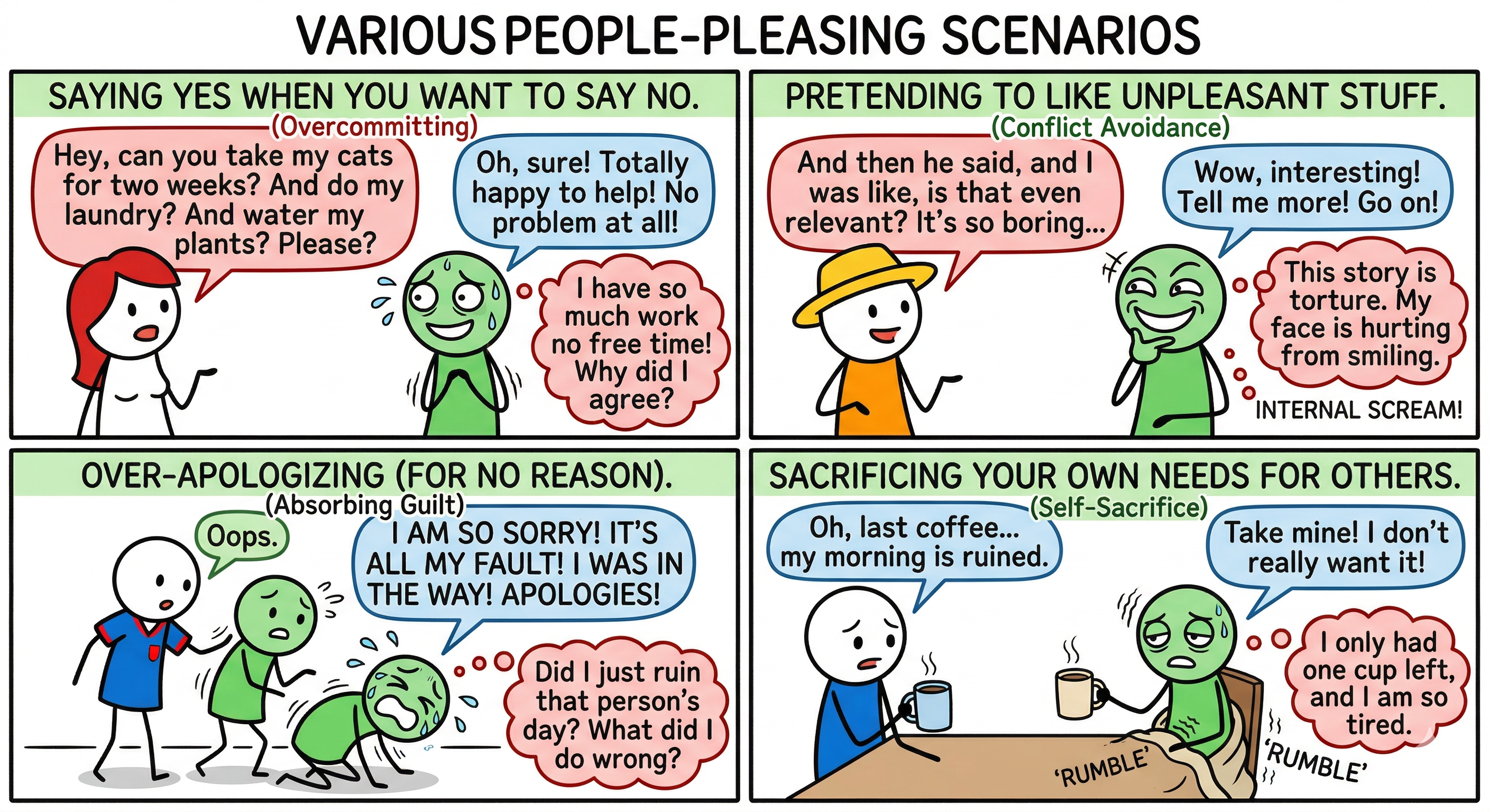People-pleasing is the pattern of prioritizing other people's comfort, approval, and happiness at the expense of your own needs, boundaries, and authenticity. On the surface, it can look like kindness or generosity, but underneath it is usually driven by a fear of rejection, conflict, or abandonment. People-pleasers often struggle to say no, feel responsible for other people's emotions, and shape their behavior around what they think others want. The roots of people-pleasing frequently trace back to childhood -- growing up in an environment where love felt conditional on being 'good,' helpful, or invisible. Over time, people-pleasing becomes exhausting because you are constantly performing instead of being yourself. Recovery involves learning that your worth is not determined by how useful you are to others, and that honest relationships require you to show up as a whole person, not just the parts that make other people comfortable.