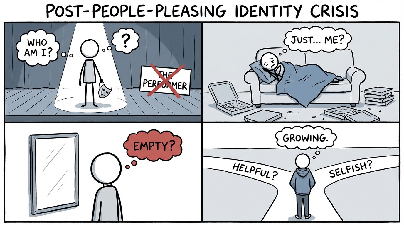 The post-people-pleasing identity crisis is what happens when you finally stop orienting your entire life around other people's needs and preferences -- and realize you have no idea who you are without that role. For years, maybe decades, your identity was built on being helpful, agreeable, accommodating, and easy to be around. You knew exactly what everyone else wanted, and you shaped yourself accordingly. Then one day -- through therapy, burnout, or a breaking point -- you decide to stop. And the silence that follows is terrifying. Without the constant task of managing other people's comfort, you are left face-to-face with a version of yourself you barely recognize. Harriet Braiker, in her work on the 'disease to please,' described how people-pleasing becomes an identity rather than a behavior -- it stops being something you do and becomes who you are. When you remove it, it can feel like there is nothing left underneath. You might struggle with the simplest decisions because you are used to outsourcing your preferences to whoever is in the room. You might feel selfish for having needs, or guilty for taking up space without earning it through service. This crisis, while deeply uncomfortable, is actually a sign of enormous growth. It means you have stopped performing long enough to notice the performance. The emptiness you feel is not proof that you are hollow -- it is the open space where your real self finally has room to grow. Filling that space takes time, patience, and a willingness to sit with not knowing. But the person waiting on the other side of that discomfort is someone worth meeting.
