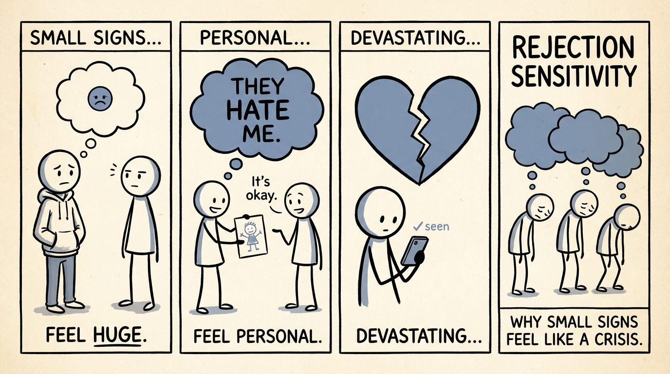 Rejection sensitivity is the tendency to anxiously expect, readily perceive, and intensely react to signs of rejection -- even when no rejection was intended. A friend not texting back feels like proof they do not care. A brief comment from a partner feels like a devastating criticism. A coworker's neutral expression in a meeting feels like disapproval. For people with high rejection sensitivity, these moments are not minor annoyances -- they trigger a cascade of painful emotions that can feel as intense as actual rejection. The concept was developed by psychologist Geraldine Downey, whose research shows that rejection sensitivity often develops from early experiences of rejection, criticism, or conditional acceptance. If love and approval felt unreliable or could be withdrawn at any moment, your brain learned to scan for danger signals constantly. The result is a hypervigilant social radar that detects threats that may not exist, leading to defensive reactions -- withdrawal, anger, or preemptive rejection -- that can damage the very relationships you are trying to protect. Working through rejection sensitivity involves learning to slow down the automatic reaction, reality-test your interpretations, and build a more stable internal sense of worth.