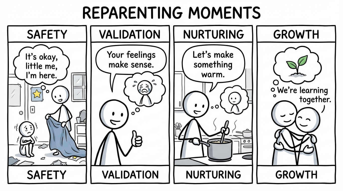 Reparenting means consciously becoming the kind, steady inner caregiver you needed as a child -- responding to your own distress with presence instead of criticism.