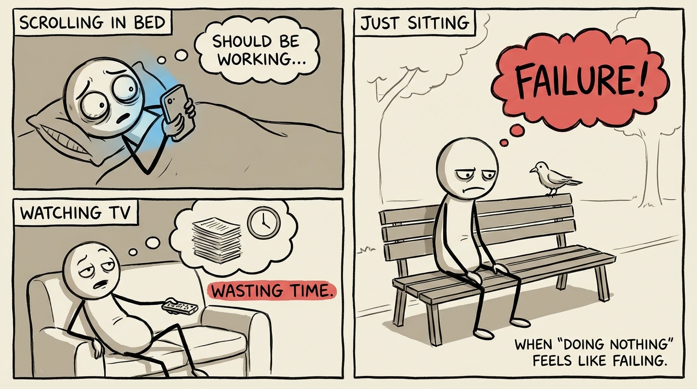 Rest guilt is the nagging, persistent feeling that you should be doing something productive whenever you try to relax, take a break, or simply exist without an output. It is the voice that whispers 'you are wasting time' when you sit on the couch, the anxiety that creeps in on a Saturday afternoon when you have no plans, the compulsion to check email during vacation. Rest guilt is not laziness in disguise -- it is often the opposite. It tends to afflict the most driven, conscientious, and responsible people, because they have internalized the belief that their worth is directly tied to their productivity. This belief has deep roots. Capitalist culture glorifies hustle and demonizes rest. Many people grew up in families where love was conditional on achievement, or where they saw their caregivers working themselves to the bone without complaint. Psychologist Devon Price argues in 'Laziness Does Not Exist' that the instinct to never stop working is a trauma response masquerading as a virtue. Neuroscience backs this up -- the default mode network in your brain actually needs downtime to consolidate memories, process emotions, and generate creative insight. Rest is not the opposite of productivity. It is the foundation of it. Learning to rest without guilt means unlearning the lie that you are only as valuable as what you produce -- and discovering that you are allowed to simply be.