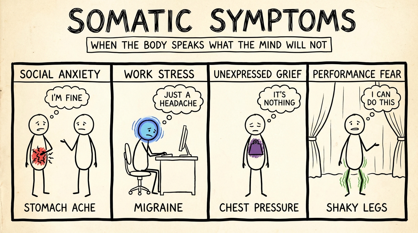 Somatic symptoms are the body's way of expressing emotional distress that has not been processed, acknowledged, or released. They show up as headaches that arrive every Sunday night before the work week, stomach problems that flare during conflict, jaw tension you did not realize you were carrying, chronic back pain with no clear physical cause, or fatigue that sleep does not fix. These are not imaginary symptoms -- they are real, physical manifestations of emotional and psychological stress. The mind-body connection is not a metaphor. Research in psychoneuroimmunology has demonstrated that chronic stress, unprocessed trauma, and suppressed emotions produce measurable changes in the body: elevated cortisol, increased inflammation, disrupted gut function, and altered pain processing. Bessel van der Kolk's work has shown that trauma is stored not just in memory but in the body itself -- in muscle tension, posture, breathing patterns, and nervous system activation. Peter Levine's Somatic Experiencing framework emphasizes that the body holds what the conscious mind cannot or will not face. When you grow up learning to push through, stay strong, or ignore your feelings, the emotions do not disappear -- they get rerouted. The body becomes the messenger for everything the mind refuses to open. Healing somatic symptoms often means learning to listen to the body's signals with curiosity rather than frustration -- and recognizing that the ache is not the problem. It is the body's attempt to tell you what the problem actually is.