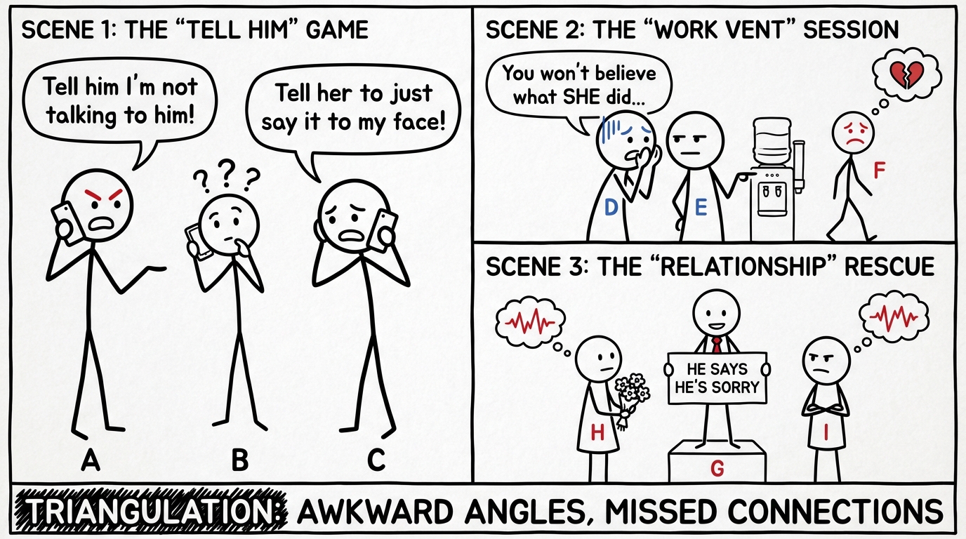 A person is stuck in the middle of two family members, physically relaying messages back and forth between people who refuse to speak directly to each other -- a visual metaphor for triangulation.